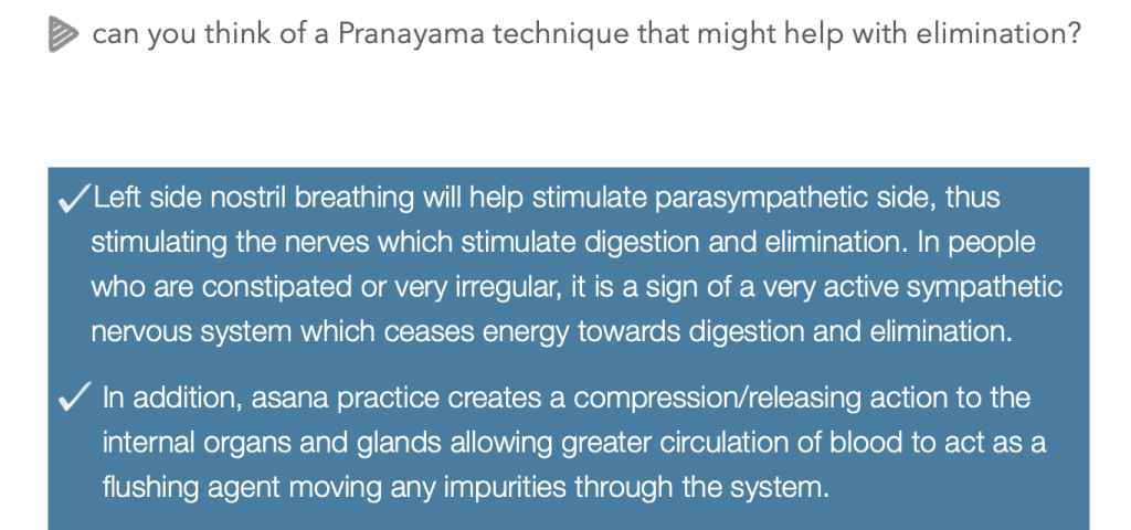 Again the ability of yoga asana to create circulation and movement in the internal organs, particularly the colon assists in the digestion process by moving food through the track avoiding stagnation which creates blockages that can lead to illness and disease.
