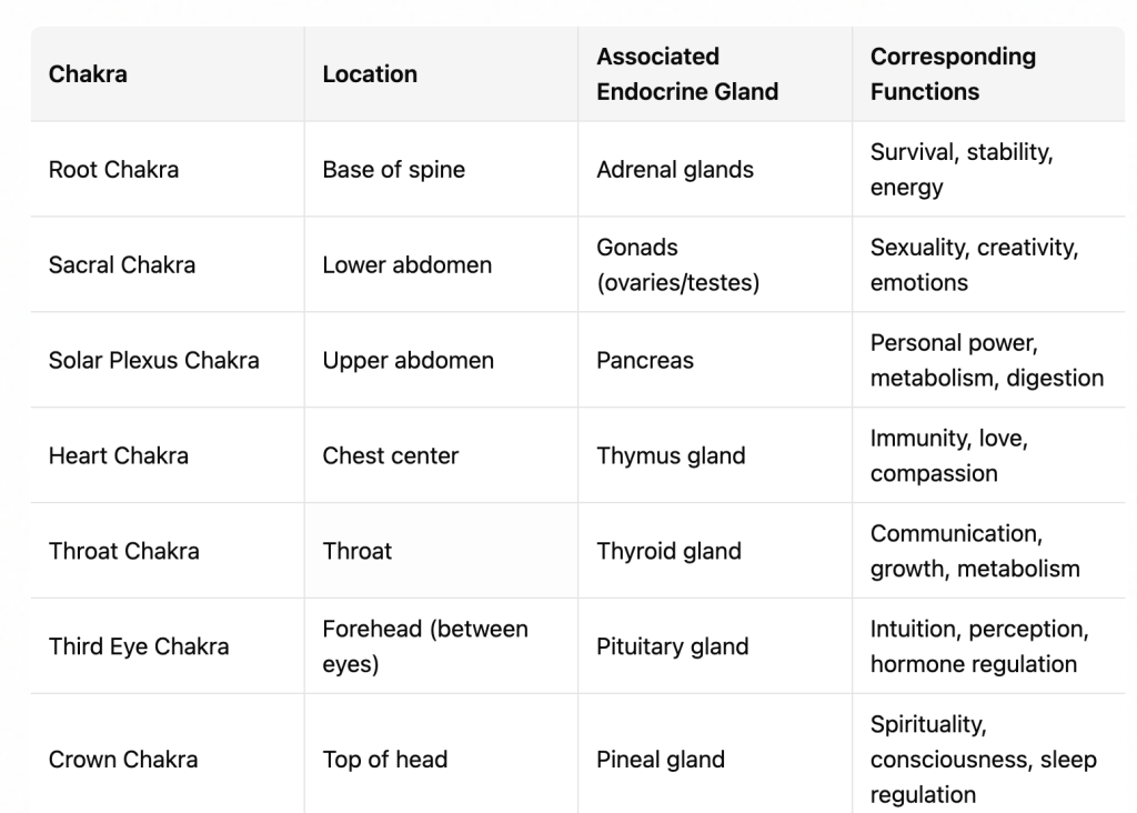 The endocrine system and the chakra system are two different frameworks for understanding how the body and mind interact, one from a scientific perspective and the other from a more spiritual or traditional perspective. However, some correlations are often drawn between the two, especially in holistic health, yoga, and alternative medicine. They are as follows: